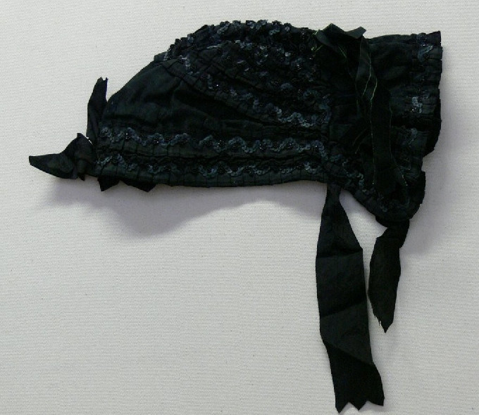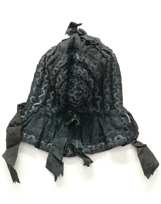Leírás: Fekete klottból, sötétkék alapú, fehérpettyes kartonnal bélelve készült két részből a feje, egy széles, bő fodorral. A főkötő elején két sorban hosszában, hátlapján ugyancsak két sorban, félköralakban, majd keresztben nyolc sorban fekete gyöngyös, islogos rátétdísz van elhelyezve, hajtogatott fekete taftszalagon. Elől fakult szalagcsokor, hátán gyűrött, zöld szélű, fekete szalagcsokor. Nyakban utólag odatett fekete selyemszalag.