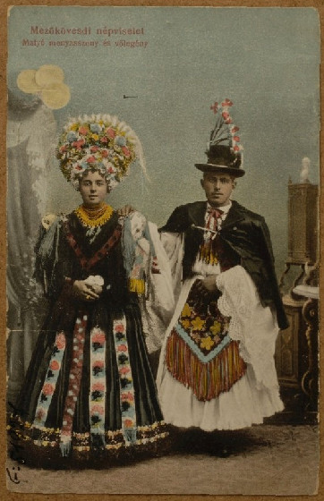 Tartalom: Menyasszony és vőlegény viselete, fénykép alapján készült képeslap. Semayer Vilibáldnak, a Néprajzi Múzeum igazgatójának címzett képeslap. Az öltözet különlegessége, hogy a menyasszony fekete ruhát visel. A képeslap alapjául szolgáló fotó Weisbach Rilly mezőkövesdi fényképész műtermében készült.