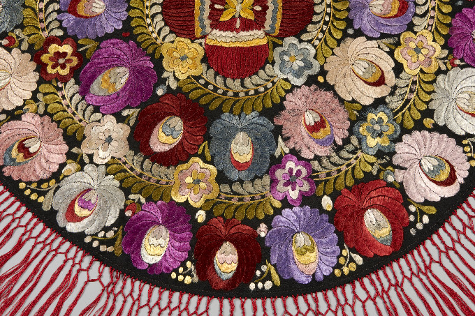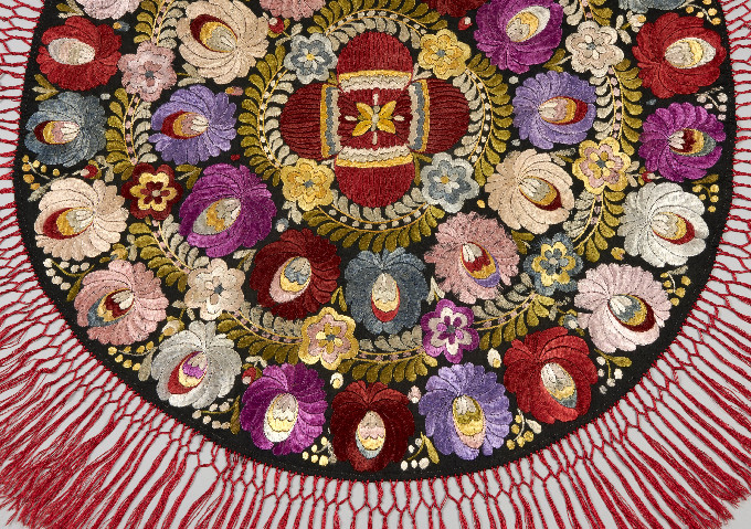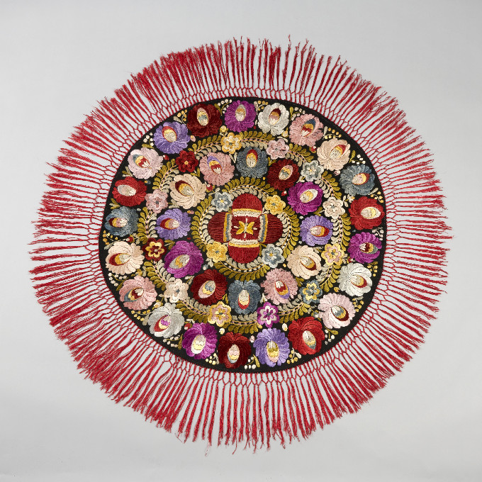 Leírás: Kerek, fekete klott, széle kézzel szegett. A terítő teljes felülete színes (piros, bordó, fehér, kék, rózsaszín, sárga, zöld többféle árnyalatban), selymes hatású pamut hímzőfonallal hímzett, laposöltéssel, száröltéssel. Mintája koncentrikusan szerkesztett: középen négy ún. szűcsrózsa, ekörül virágfejekkel díszített leveles ág, majd különféle színű, nagy matyó rózsák, egy újabb leveles virágos sor után ismét matyó rózsák. A terítő szélén piros csomózott rojt.