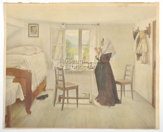 Tartalom: Az eredeti festmény 1900-1910 között készült. Falusi szobában, a szombati ünnepre terített asztal mellett áldásra emelt kezű behunyt szemű nőalak látható. A ritkán ábrázolt zsidó szobabelső hasonló más falusi szoba berendezéshez. Kivételt képeznek a rituális tárgyak pl. gyertyatartó, kidduspohár, mezüze, fűszertartó. Aranyozott keretbe helyezett színes olajnyomat.