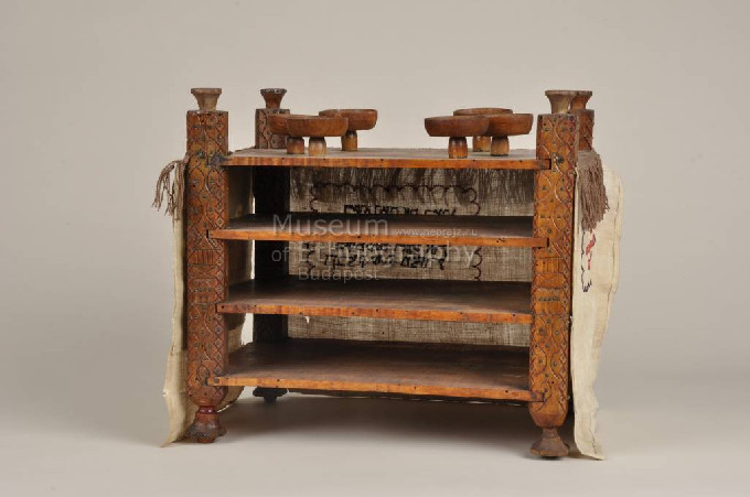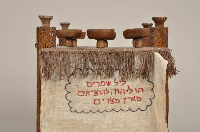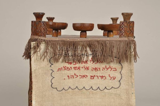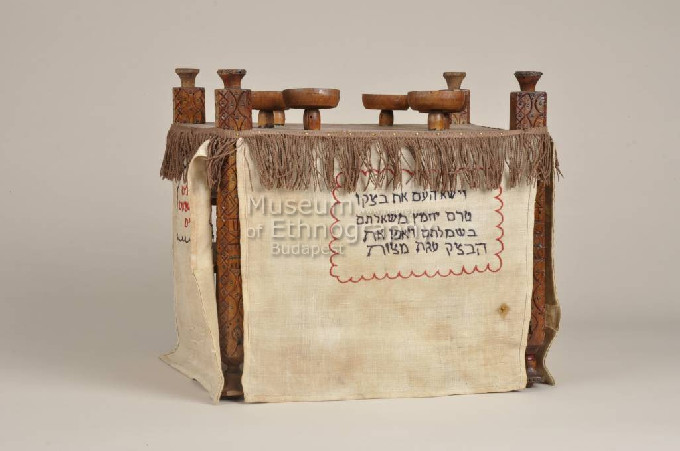 Leírás: Faragott, szögletes, emeletes macesztartó állvány, tetején szédertállal, oldalán hímzett textilborítókkal. Négy faragott oszlopba csapolt három vízszintes lap a maceszlapok, illetve egy negyedik, legfelső, hat kis faragott tálkával a rituális ételek számára. Az állvány három oldalát héber feliratokkal hímzett vászonlap fedi: „És vitte a nép a tésztáját, mielőtt megerjedt volna, teknőiket bekötve ruháikba vállukon.” (2Móz 12:34.) „És megsütötték a tésztát, […] kovásztalan lepénynek” (2Móz 12:39). „És egyék a húst azon az éjjel, tűzön sütve, kovásztalan kenyérrel s keserű füvekkel együtt egyék.” (2Móz 12:8.) Felső élén aranyszínű rojt fut körbe. A negyedik vászonlap hiányzik.